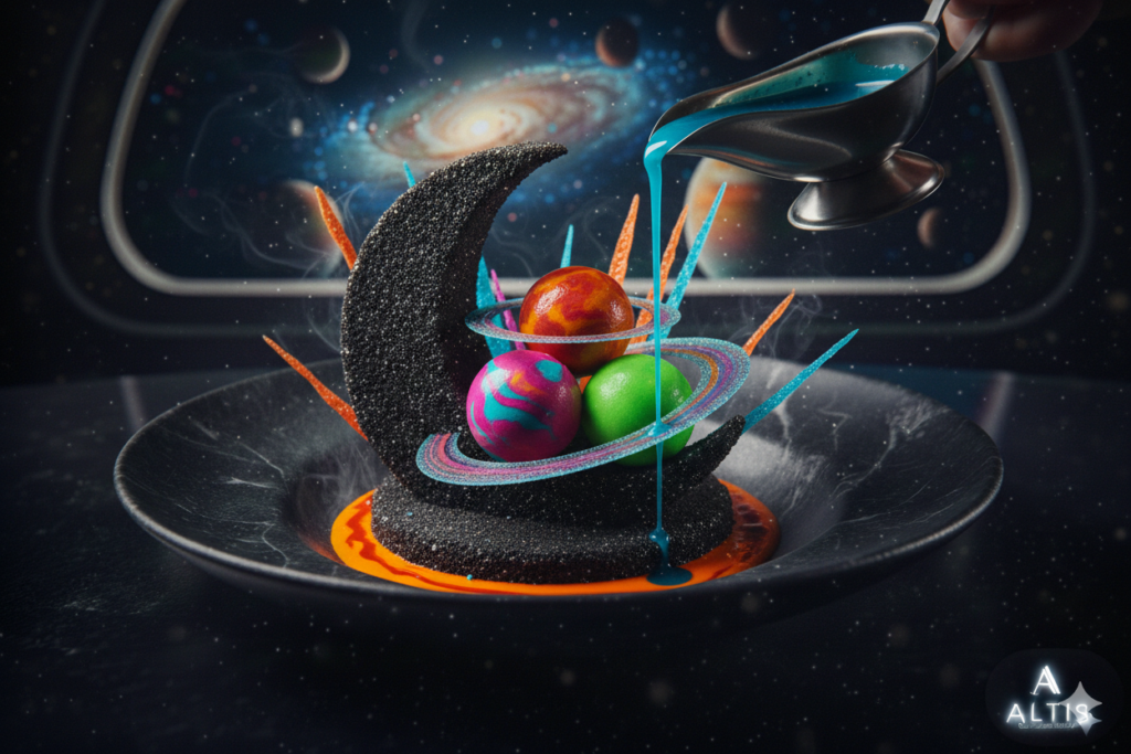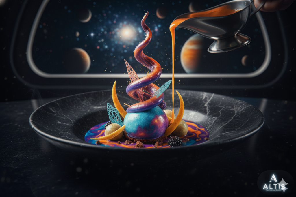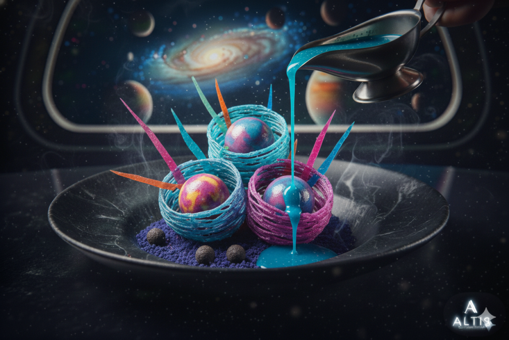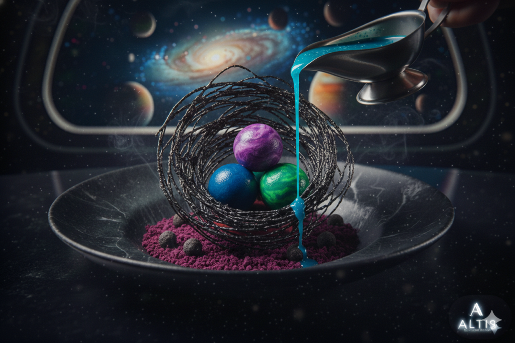 Une immersion onctueuse dans les jardins de Mars. Ce velouté d’asperges blanches est sublimé par une pluie de noisettes torréfiées et une émulsion légère comme un nuage de gaz stellaire. Une entrée qui ne manque pas d’atomes crochus. Prix : 28 €